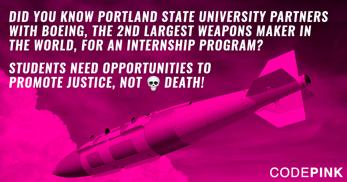 Did you know that the Portland State University School of Business partners with Boeing, the second-largest weapons manufacturer in the world, for a βsupply chainβ internship program? Sign our letter to the Dean of Portland State University demanding that they sever ties with Boeing!